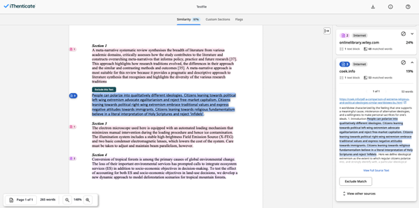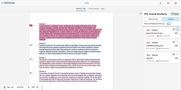Below you can find an example of a submitted file (test file) which shows 97% similarity with online sources part of the iThenticate database.