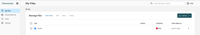 To start a new plagiarism scan you must select the folder ‘My Files’. After selecting the folder, the section ‘Upload’ appears on the right side of the screen. You can submit your document by choosing ‘Upload’.