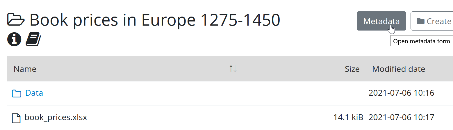 Structured metadata is reusable. The metadata form includes a button “Clone from parent folder”. One way to use this feature is to create a project-level folder with several subfolders for data. Common metadata elements for the project can be entered in the project-level folder. This metadata can then be copied to the data folders and filled in further.